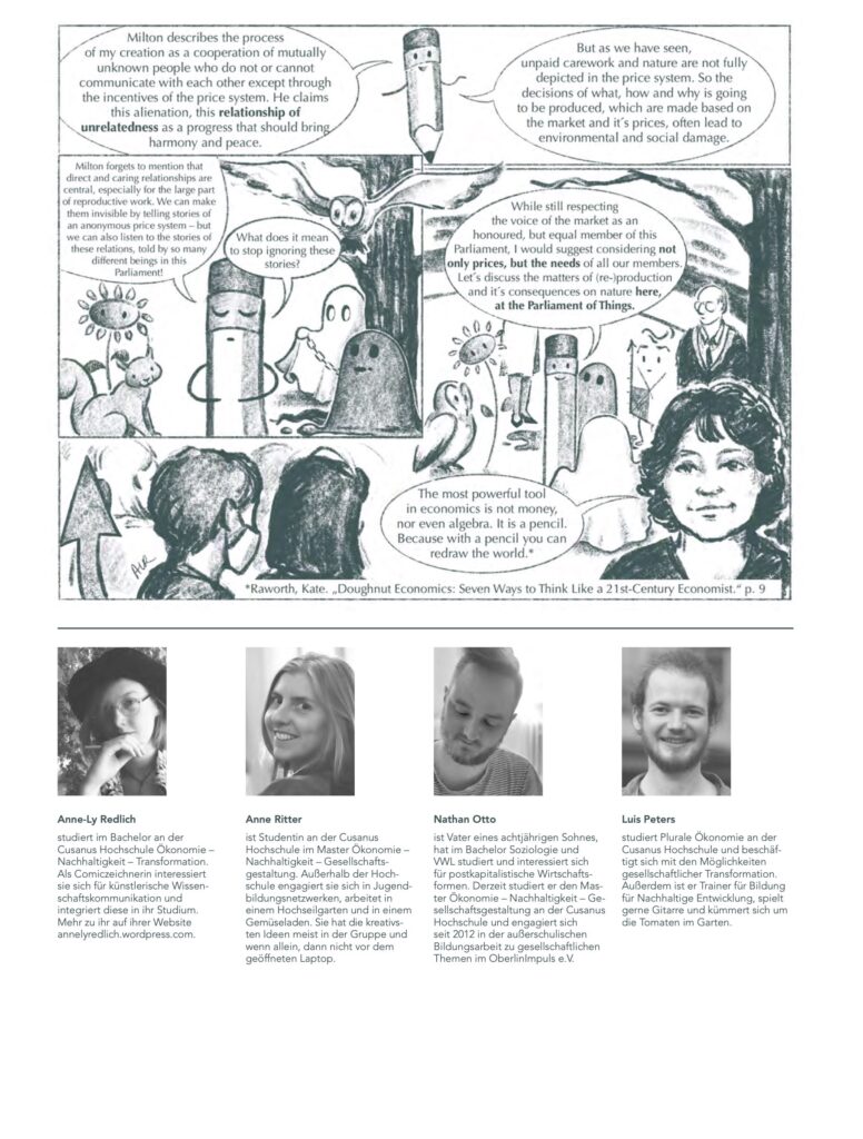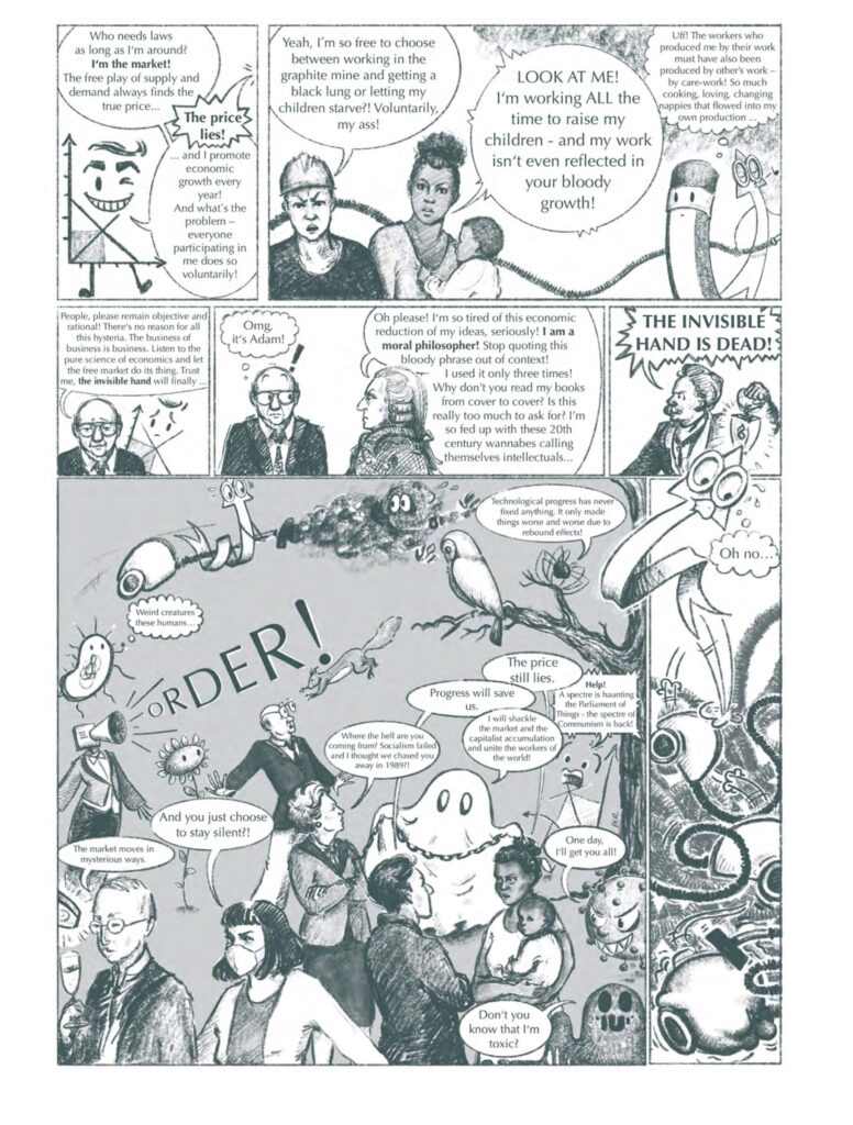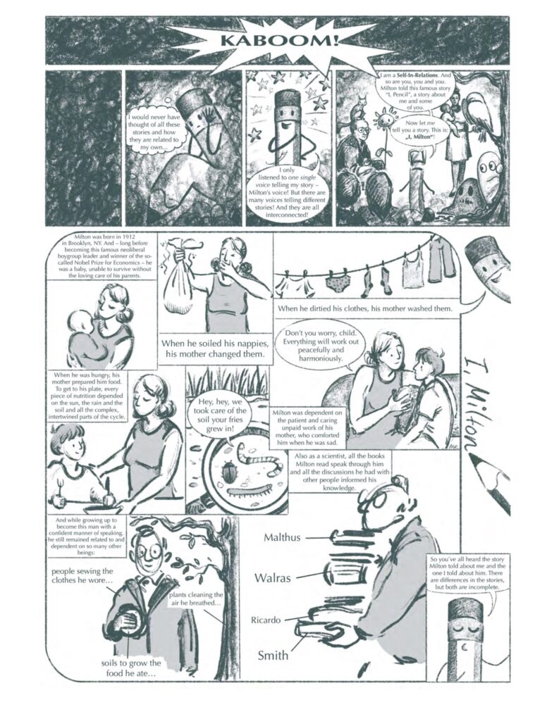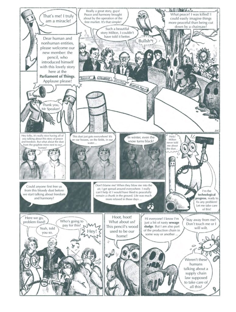 Milton Friedman, eine der Gründungsfiguren des Neoliberalismus, erklärte dem US-Fernsehpublikum in den 1980er Jahren in der Fernsehshow Free to Choose die Welt – aus neoliberaler Sicht. In einer der Sendungen kam ein Bleistift zu Wort, der die eigene Herstellungsgeschichte erzählte: I, Pencil. Diese Geschichte ist voller Leerstellen und blinder Flecken, die symptomatisch für die Verkürzungen des ökonomischen Mainstreams, insbesondere des Neoliberalismus sind. Der folgende Comic füllt diese Leerstellen und leuchtet die blinden Flecken aus: Der Bleistift und das damit verbundene Parlament der Dinge kommen zu Wort.