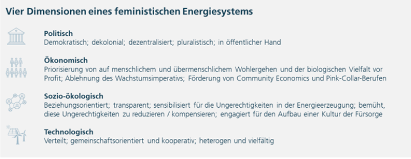 Ein intersektionales feministisches Energiesystem hinterfragt die vorherrschenden weißen hetero-patriarchalen Strukturen ungleicher Machtverhältnisse kritisch und setzt sich für eine inklusive Energiewende ein, in der die Stimmen marginalisierter Menschen und Gemeinschaften gleichwertig mit denen weißer männlicher Eliten gewertet werden. Ein feministisches Energiesystem fordert Gerechtigkeit an mehreren Fronten, einschließlich Verteilungs-, Verfahrens-, Anerkennungs- und Erdsystem-Gerechtigkeit für alle, und umfasst dabei politische, technologische, wirtschaftliche und sozio-ökologische Dimensionen (mehr dazu in untenstehender Grafik).